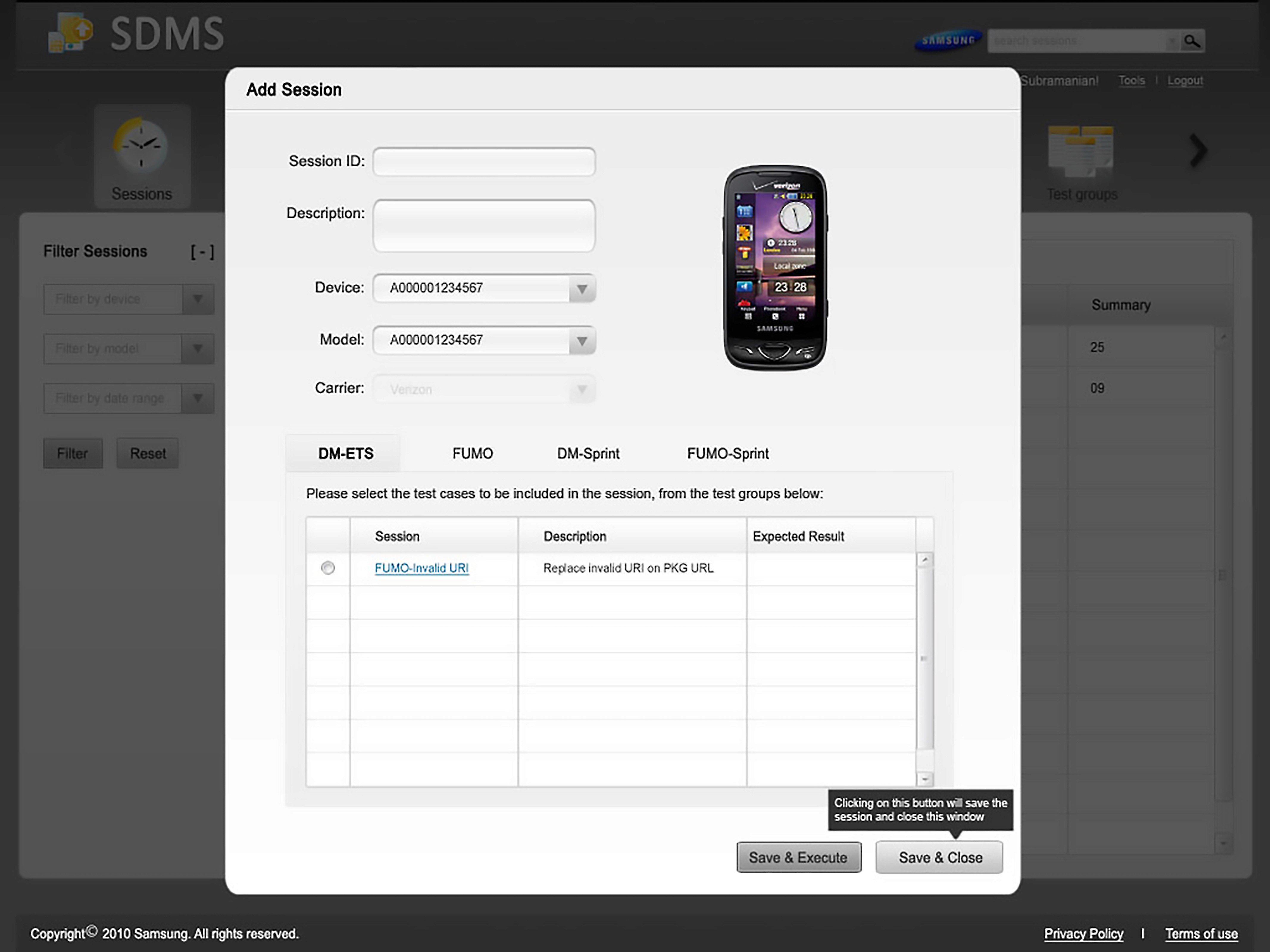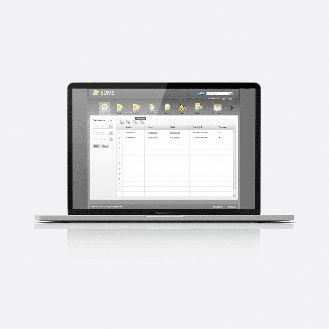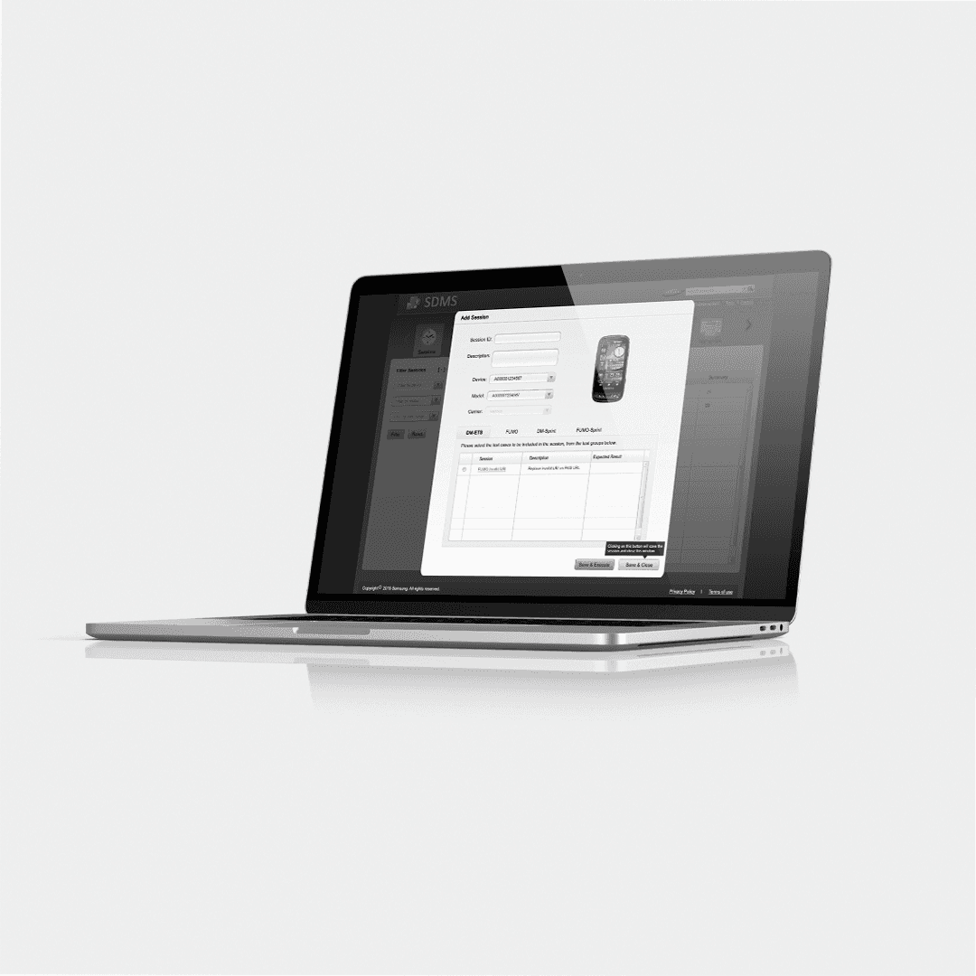This product is a web based application for testing the features of mobile phones. This project was an initiative from Samsung ODC located in Bengaluru. This project involved creation of SDMS, a web application which helps the testers who test the features of Samsung mobile phones. The application allows the users to create and manage the test sessions, their related artefacts (like test suite, test cases etc.) and also analyze the results of testing through the reports created by the system.