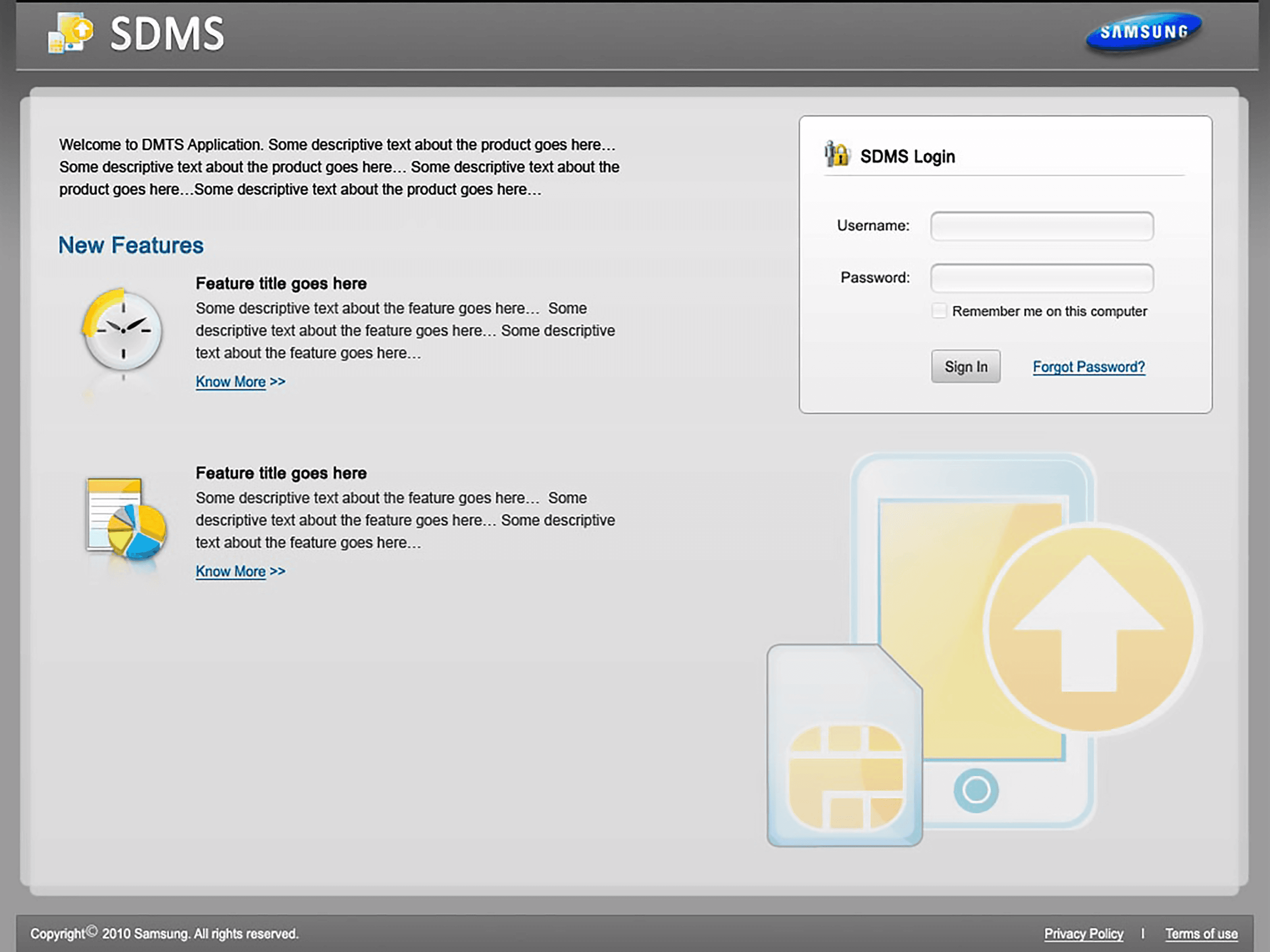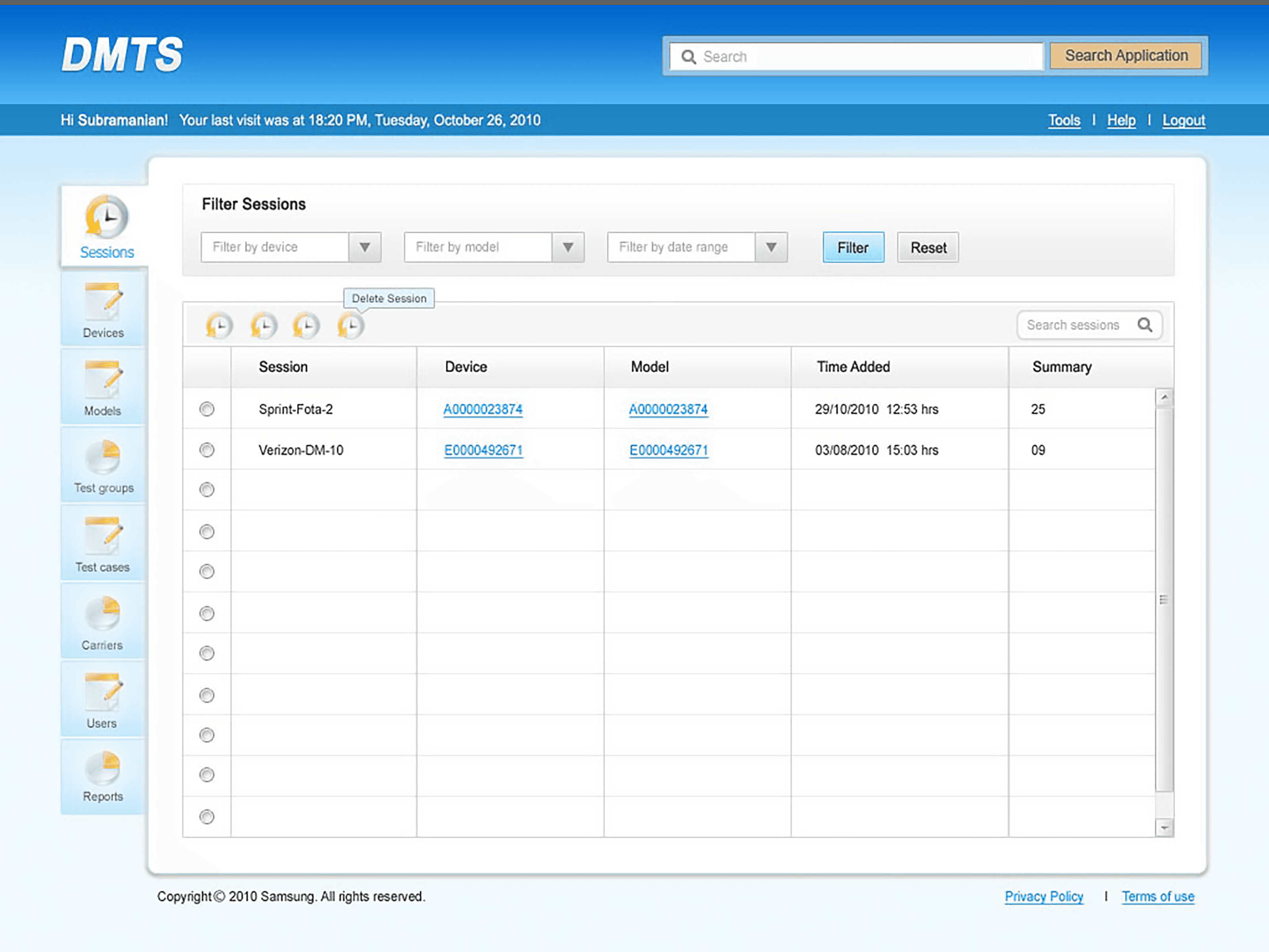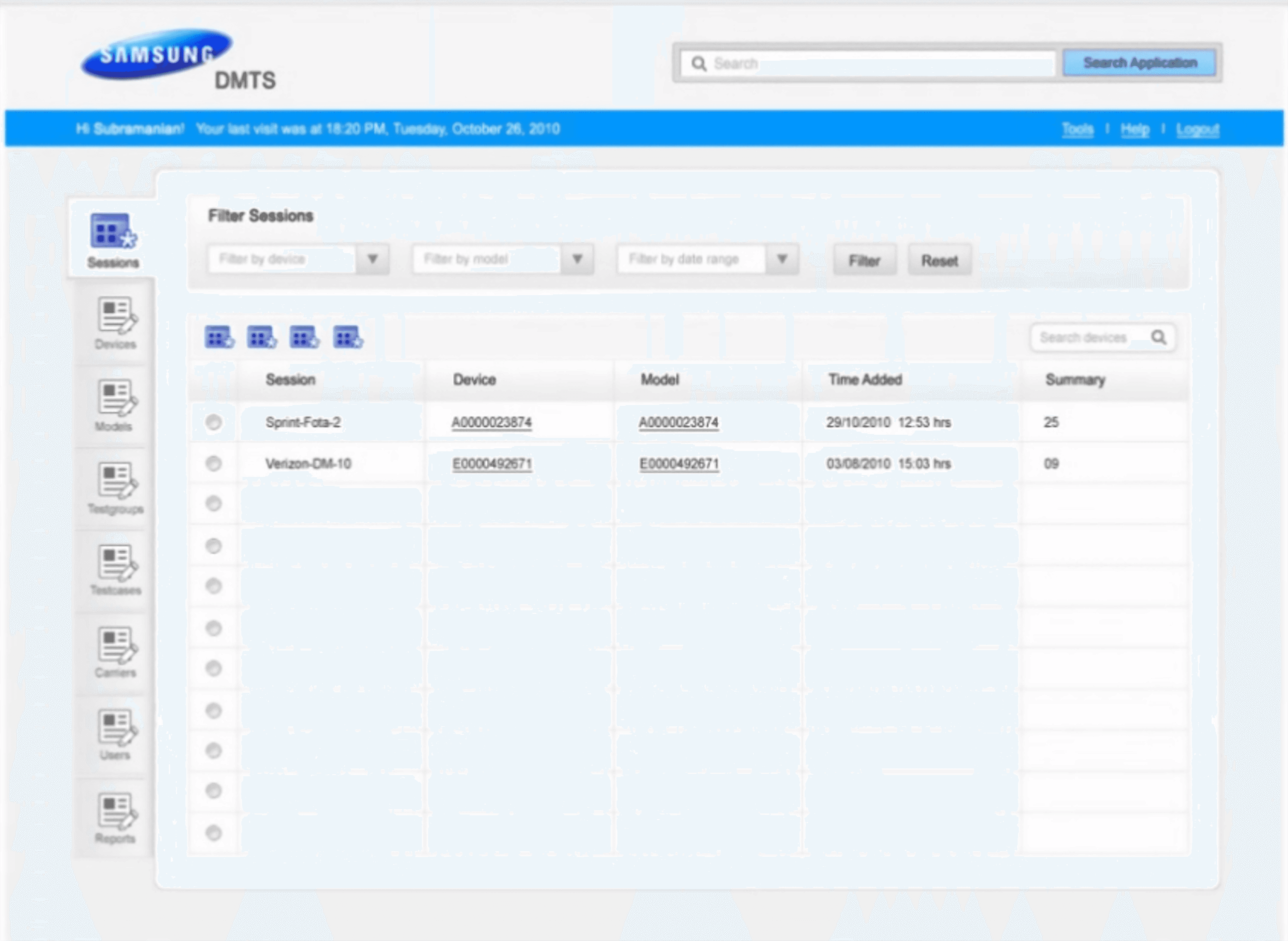 This product is a web based application for testing the features of mobile phones. This project was an initiative from Samsung ODC located in Bengaluru. This project involved creation of SDMS, a web application which helps the testers who test the features of Samsung mobile phones. The application allows the users to create and manage the test sessions, their related artefacts (like test suite, test cases etc.) and also analyze the results of testing through the reports created by the system.